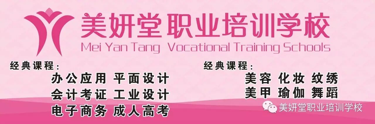 美妍堂学校开设的课程有:美容、化妆、纹绣、美甲、Office办公、平面设计、工业设计、会计考证、电子商务、淘宝美工、面点师、育婴师、茶艺师、维修电工、蜕变训练营、口才演讲等王牌金典课程,如有意向的有缘人,请拨打电话