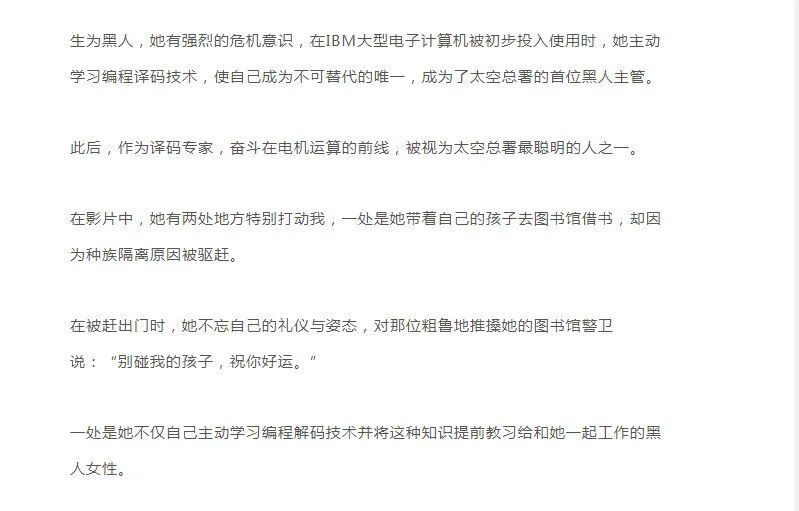 影片里,她时刻在争取机会展示自己的数学天赋。第一次是在被同事用墨水笔涂黑的数据外计算出红宝石不能支撑轨道飞行的机密。